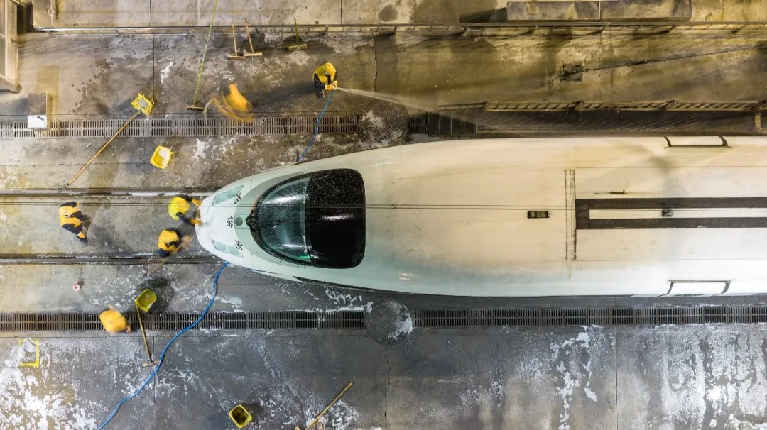 04时22分,安徽,工人师傅们在南京动车段合肥南动车运用所洗车。张大岗 摄