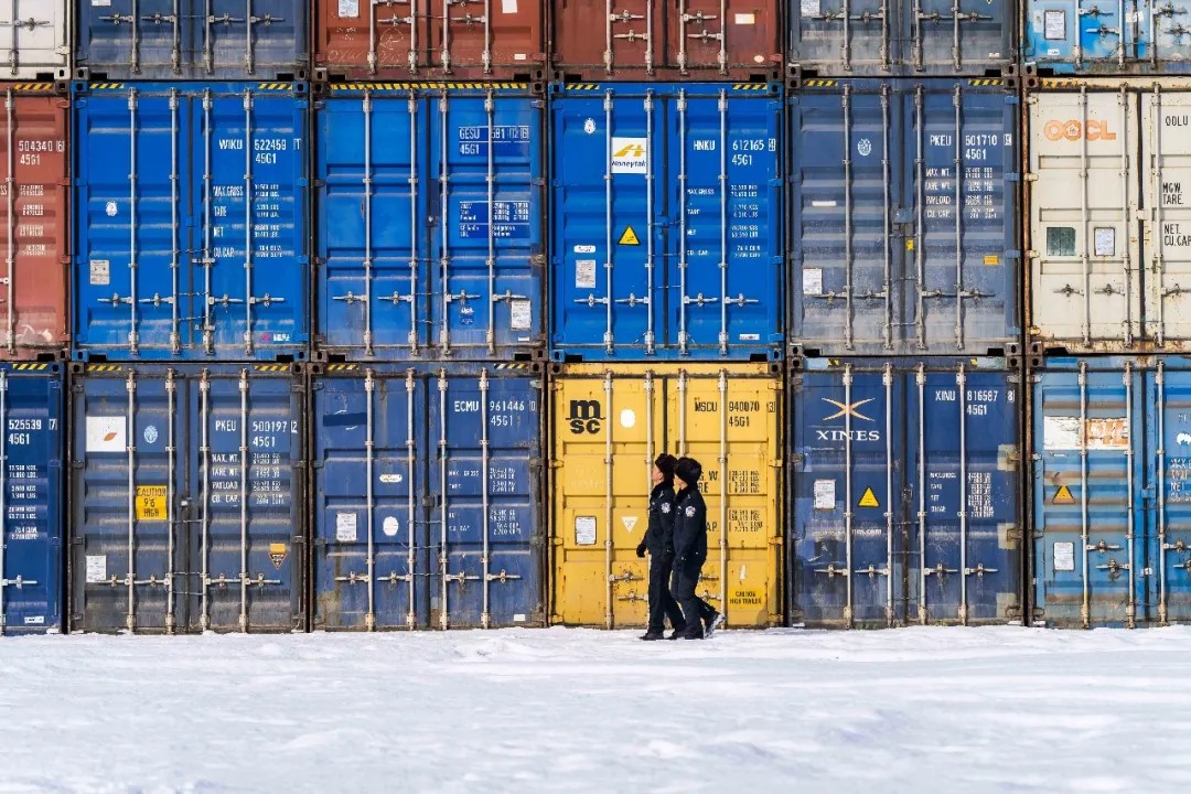 12时21分,新疆,乌鲁木齐铁路公安处的民警正在货柜存放区进行安全巡视。李国贤 摄