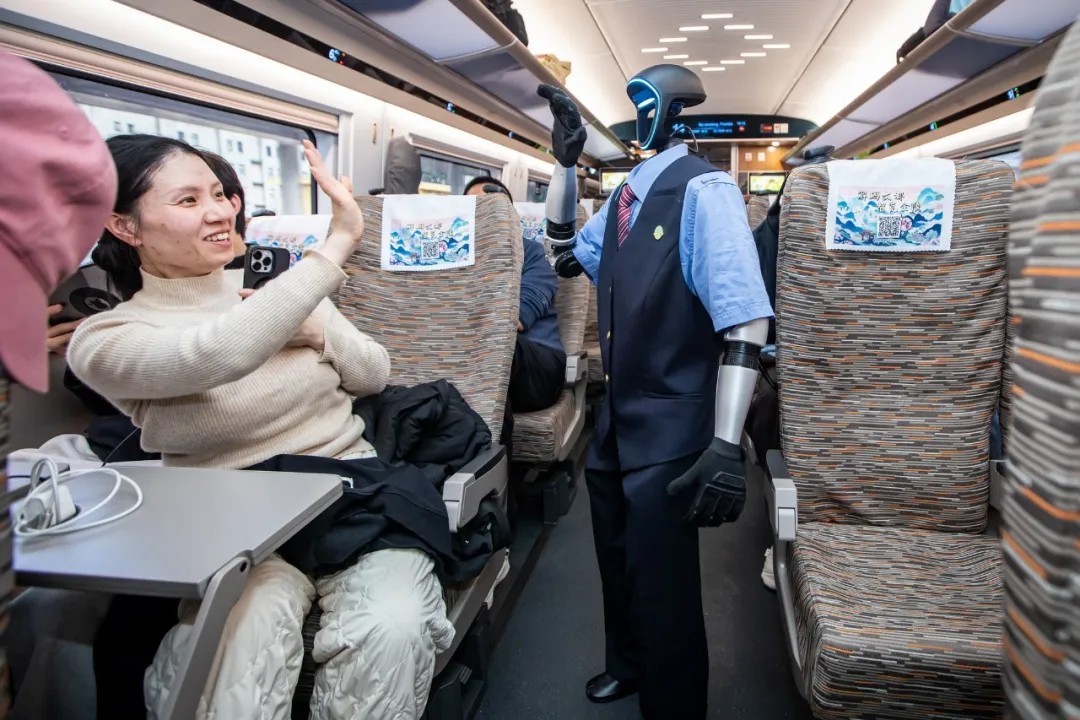 16时18分,浙江,机器人乘务员“福兴”在杭州客运段“西子号”列车上与旅客互动。 陈中秋 摄