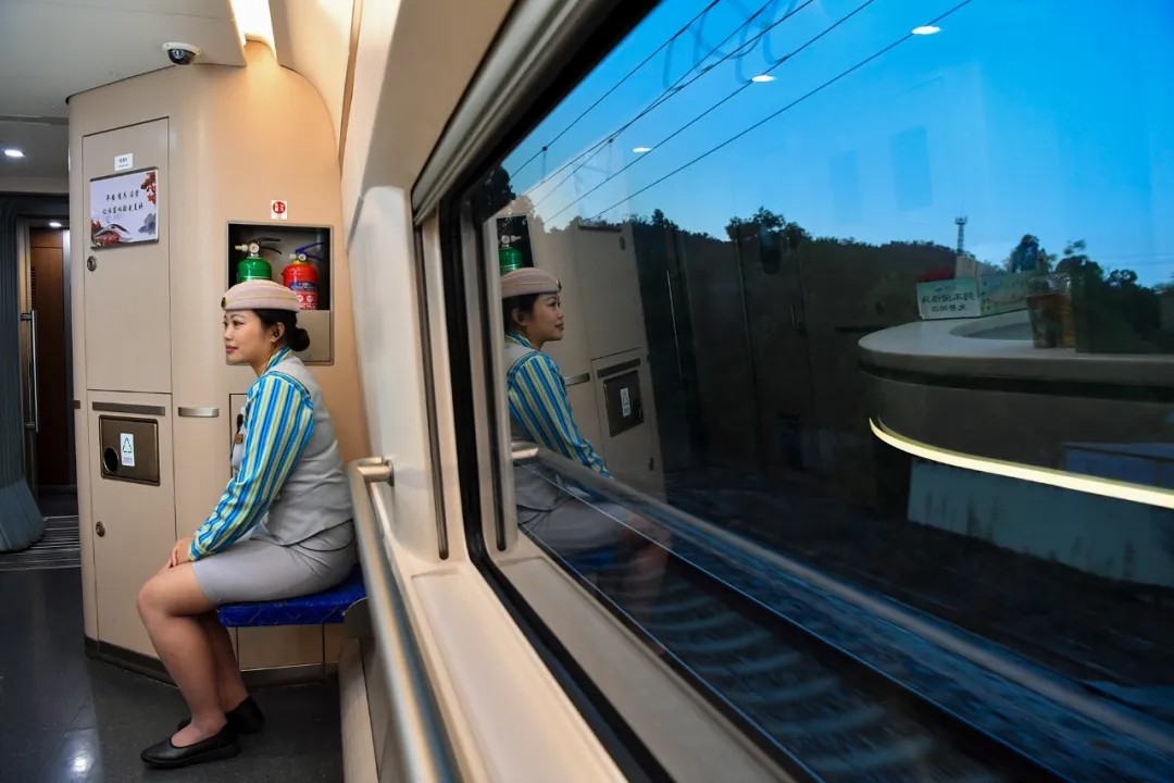 18时39分,海南,列车员在车厢内静候,窗外是暮色中的海南山林。龙泉 摄