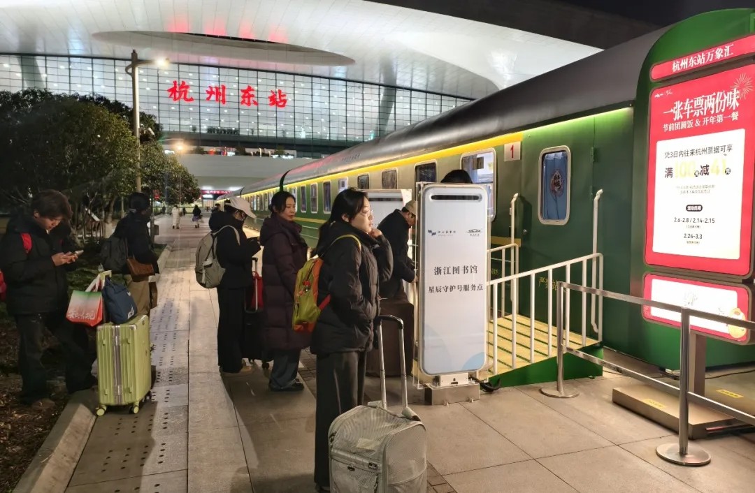 21时,杭州东站东广场,夜间中转的旅客陆续在等候“星辰守护”夜间休息区开门。这列绿皮火车每天20时至次日8时运营,专为深夜抵达并转乘次日早晨班列的旅客而设的免费歇脚点。王小川 摄