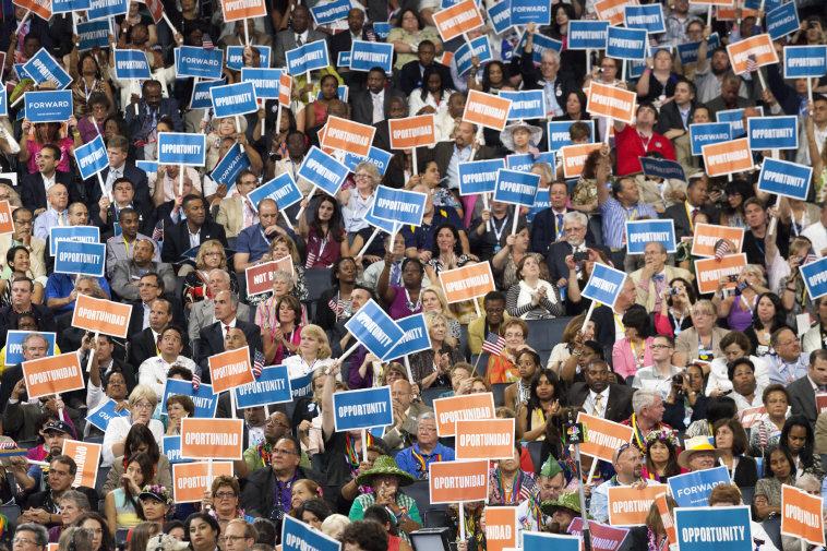 2012年,美国南卡罗莱纳州夏洛特市,民主党大会上,支持者们举着色彩各异的标语。