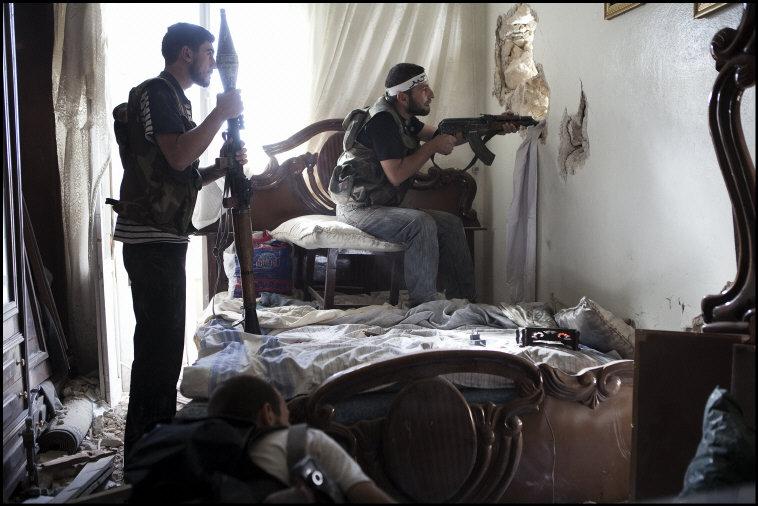 当地时间2012年10月19日,叙利亚阿勒颇市,Al Arkub前线,自由叙利亚军的武装人员正在一所民居内通过墙上挖的小洞监视政府军的一处据点。