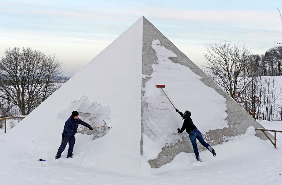当地时间2012年12月7日,列支敦士登。Miniwelt景观公园中,工人清除迷你金字塔上的积雪。该文化公园中,100多个世界各地著名景观均以125的比例展现。