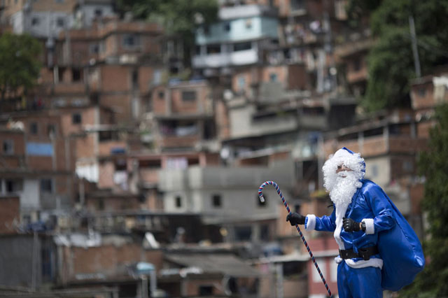巴西里约热内卢,装扮成圣诞老人在贫民窟里巡逻的警察。(Felipe Dana,美联社)
