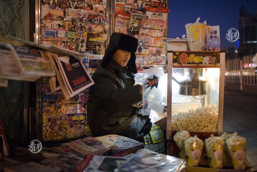 2012年12月23日,北京安定门。傍晚书报亭顺便卖爆米花的老板。刘飞越 摄