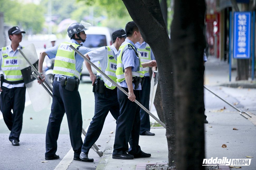 警察出手,用钢叉圈住男子腰部,将其抵在墙上;两边的警察随即持盾向前,将其夹住;另一警察用警棍将其双刀打落在地。十来秒钟,降服“双刀男”。