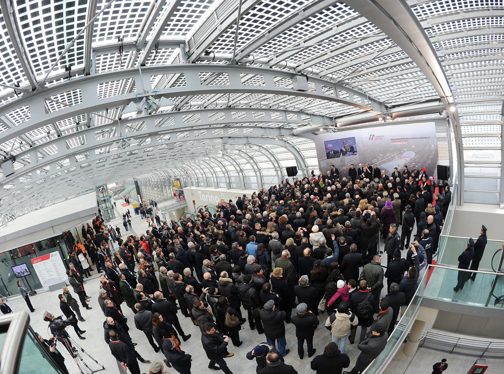人们聚集在都灵火车站前的一场就职典礼。拍摄于2013年1月14日。