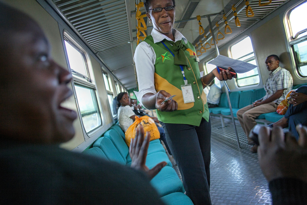 A conductor checks tickets onboard the new evening commuter train on November 13, 2012 as it winds its way from Nairobi\
