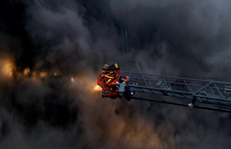 铜奖 南大街邮政大厦昨发生火灾:下午2点半,消防云梯车赶到,一名消防战士升到三楼,敲碎玻璃幕墙,将被困人员一个个救出。吴恺 摄