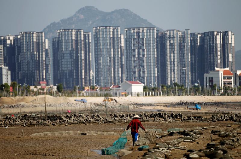 金奖 沉重的海岸线:岸边造起了高楼大厦,一个“拾海人”正在海涂上放置捕鱼工具。(2012.10.05厦门)