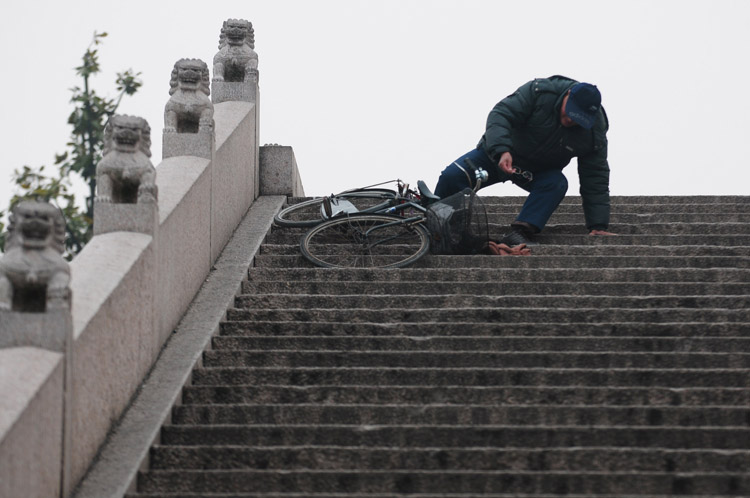 《80岁老人摔倒 市民传递“正能量”》 嘉报视觉每周最佳·第3周(摄影作品) 1月14日下午,嘉兴月河街荷月桥上,一名老人摔倒在地,眼镜摔碎眉头流血。桥上路过的市民纷纷伸手相助。