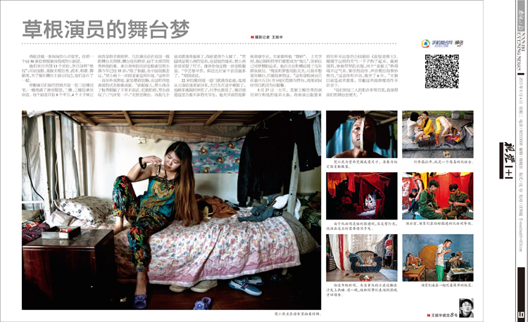 《草根演员的舞台梦》嘉报视觉每周最佳·第23周(摄影作品) 海盐县城一条深深的小弄堂里,住着一个由30多位草根演员组成的小剧团。 他们来自全国13个省份,各自身怀“绝技”:川剧变脸、美猴王模仿秀、武术、唱歌、舞蹈等,为了能在舞台上展示自己,他们走在了一起。