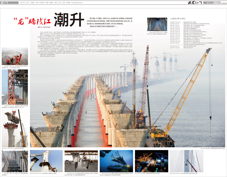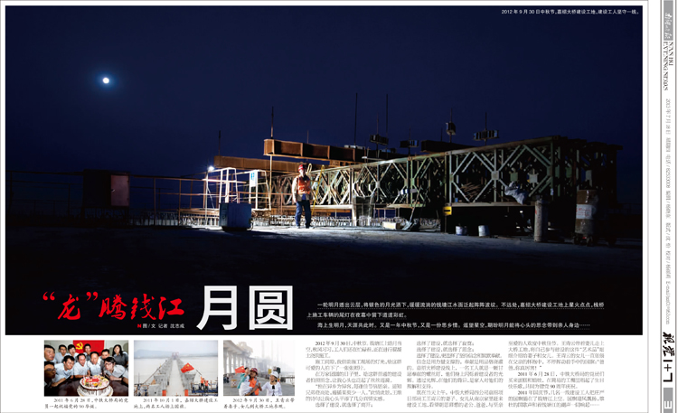 《“龙”腾钱江》 嘉报视觉每周最佳·第29周(摄影作品) 2008年12月14日,嘉绍大桥开工建设,它北起嘉兴海宁,南接绍兴上虞,桥长10公里,桥面宽40.5米,设计速度为每小时100公里。工程总造价139亿元,大桥部分投资达63.5亿元。大桥建成通车后,绍兴到上海的车程将由现在的3小时至少缩短一半。 嘉绍大桥是在“世界三大强潮区”唯一开建的一座桥。嘉绍大桥主桥长度2680米、总宽幅55.6米,是世界上主桥连续长度最长、桥面最宽的多塔斜拉桥。主桥采用独柱设计四面悬索技术,这一技术目前在国内还是首创。同