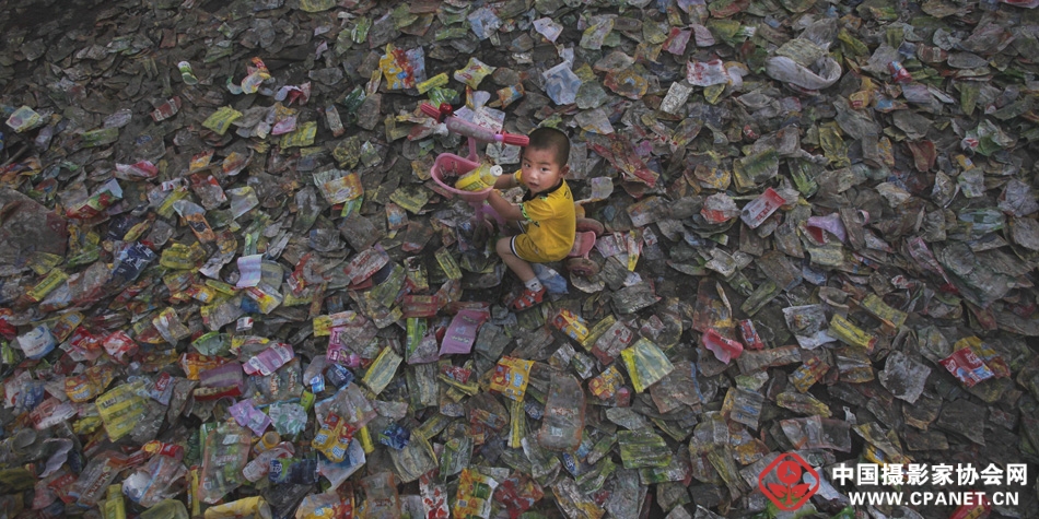 【组照】北京市朝阳区东坝乡皮村塑料瓶收集站,一位儿童在布满塑料瓶的地上玩耍