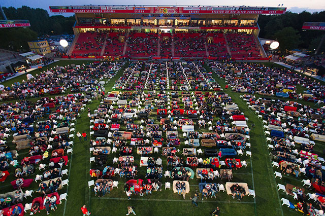 2014年6月12日,柏林联盟足球俱乐部邀请球队支持者在柏林Alte Foersterei体育场观看世界杯首场巴西对克罗地亚的比赛。球迷们自带沙发,现场设有巨大的电视屏幕,球场俨然变成了一个大客厅,场面壮观。(路透社/摄影:Thomas Peter)