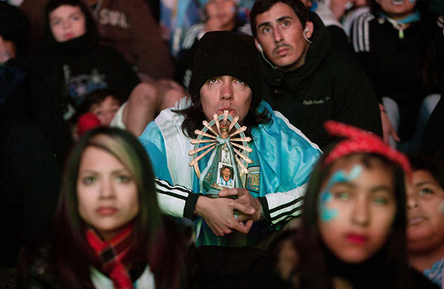 2014年6月15日,在阿根廷首都布宜诺斯艾利斯,一位球迷将贴着梅西照片的圣母玛利亚塑像捧在怀里,聚精会神地观看着户外屏幕上正在播放的阿根廷对阵波斯尼亚的比赛。(美联社/摄影:Eduardo Di Baia)