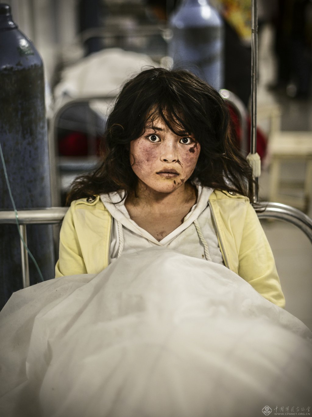 新闻人物类 铜奖 单幅 地震后幸存的女孩 2013年7月23日,中国甘肃省岷县人民医院,19岁的伤者宋旭霞坐在病床上。北京时间7月22日7时45分,甘肃省定西市岷县、漳县交界处发生了6.6级地震,造成95人遇难,一千多人受伤。地震发生后,宋旭霞独自从垮塌的自家房屋中爬出来。