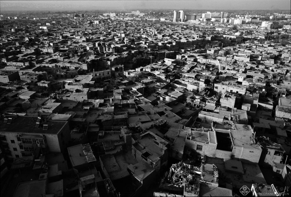 我们有一张2005年拍到的喀什老城俯瞰图,拍摄地点在喀什人民东路一建楼顶。那是傍晚夕阳下的喀什,阳光如勤劳的农民一般将密密匝匝的屋顶一块块晾晒出来,土墙黄灿灿的如鎏了一层金。一群白色的鸽子在青黑的天空里兜着圈子。