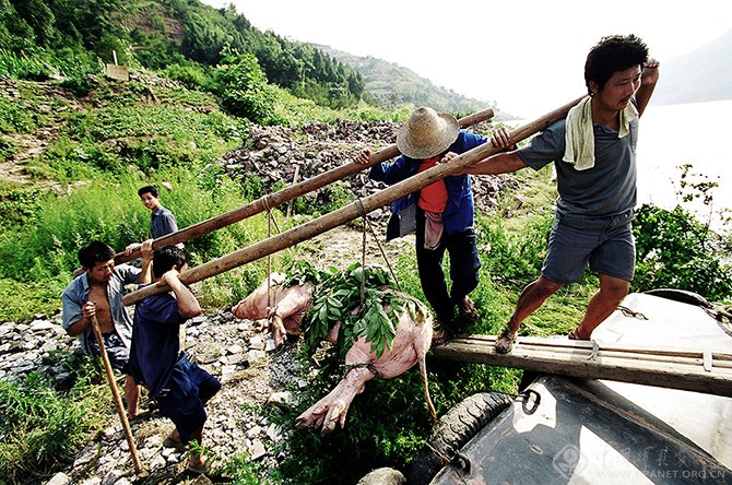 2002年7月20日,三峡库区忠县的移民正在把家里养的猪转运上船。三峡库区100多个城镇开始了大搬迁。