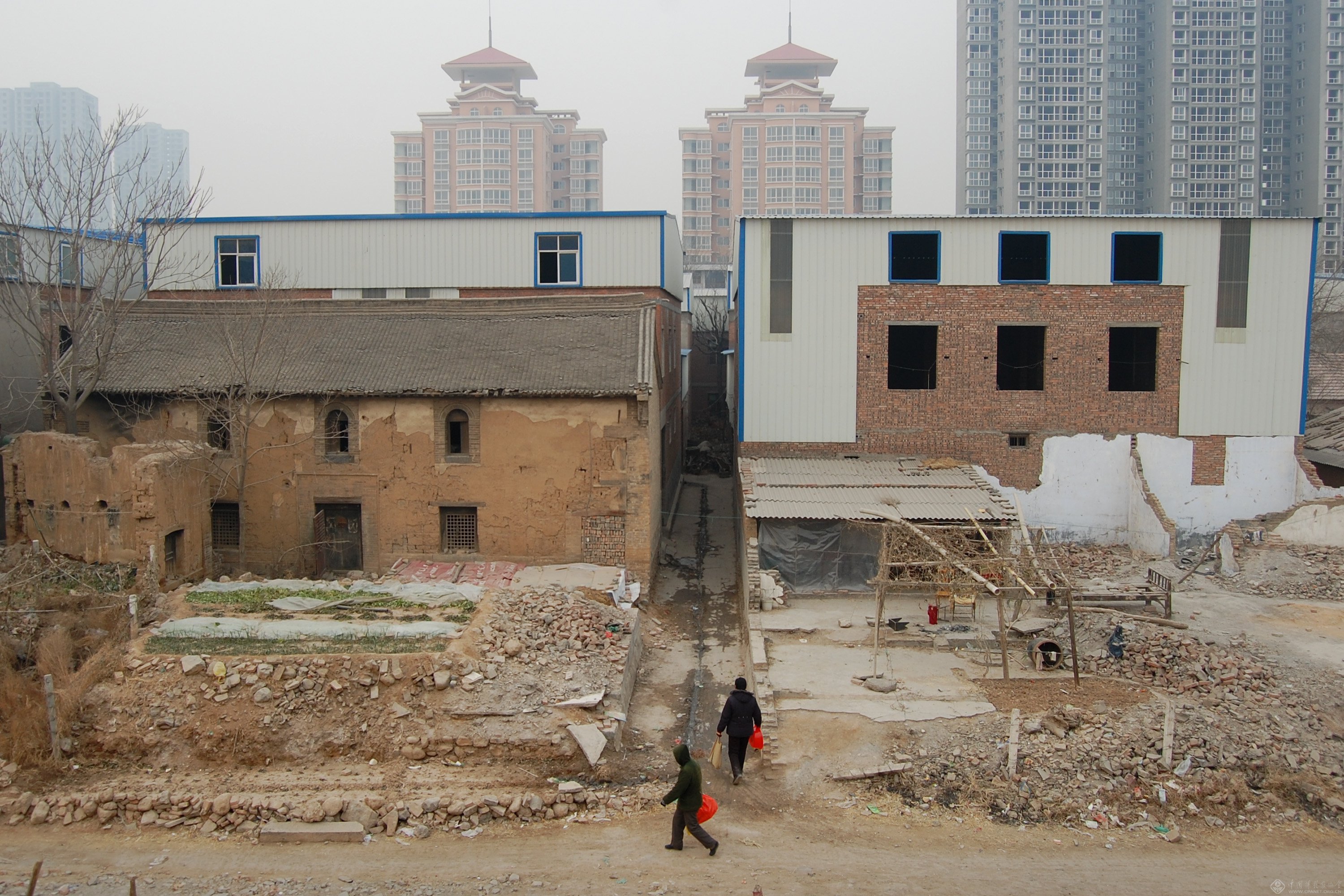 2011年1月20日,搬迁中的南水北调中线焦作城区段,老旧土坯房,临时搭建的彩钢房和远处的高楼鳞次栉比,仿佛看到了这座城市的过去、现在和将来。