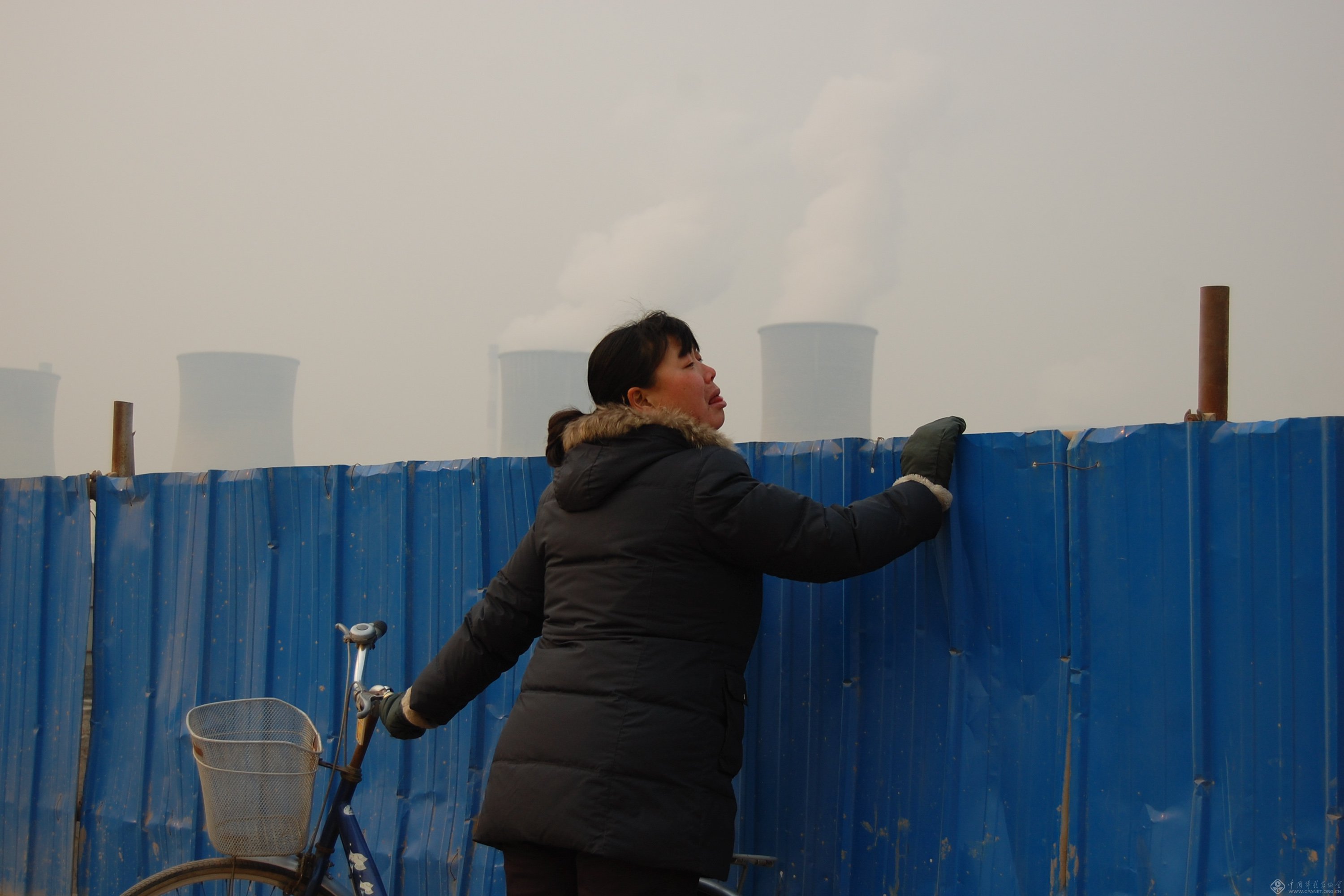 2011年1月19日,南水北调中线焦作城区段。居民停下自行车扒着围栏观看施工进度。