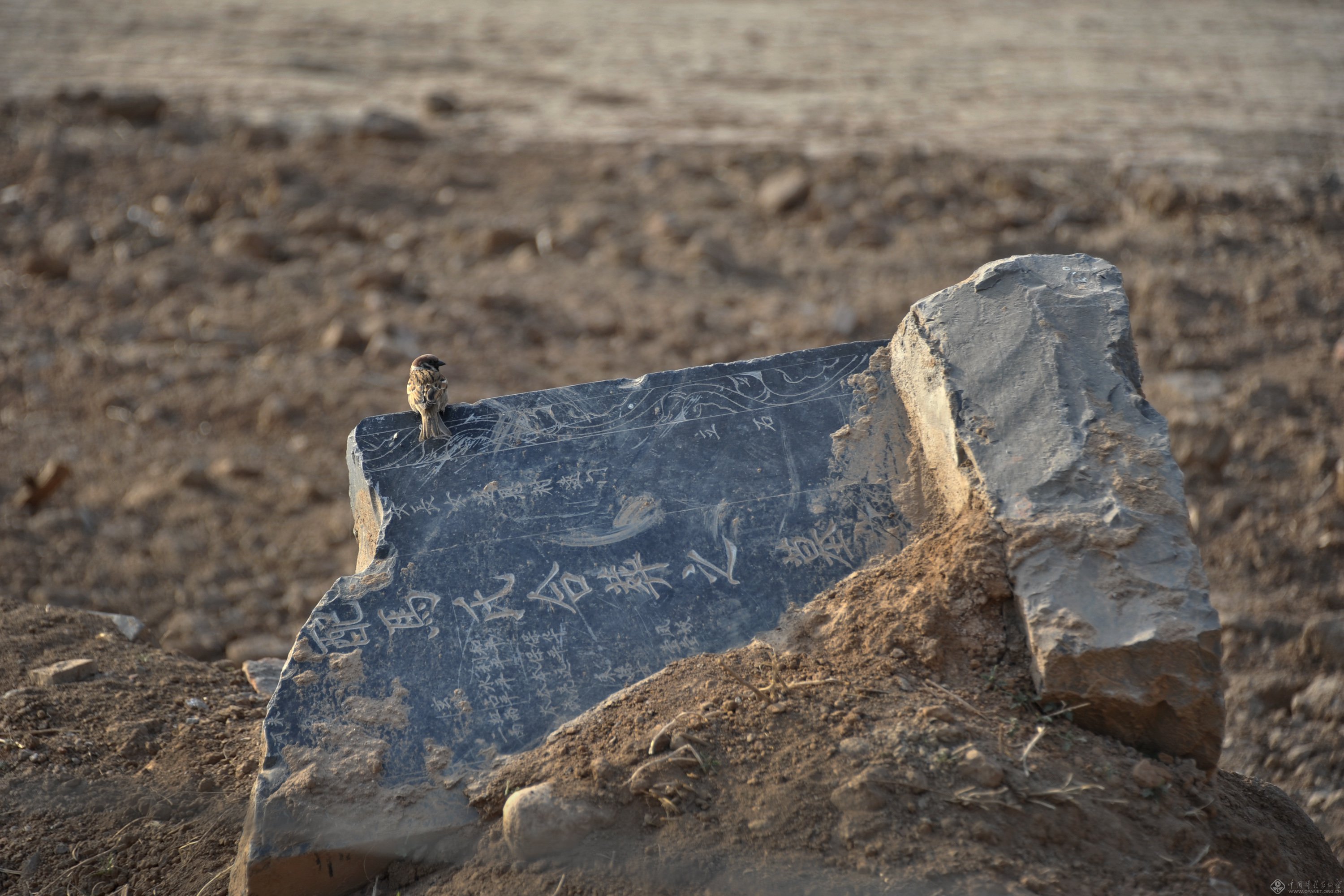 2011年4月11日,南水北调中线焦作城区段,一只麻雀停落在因施工折断的墓碑上。这块墓碑将被永远地深埋在渠堤里。