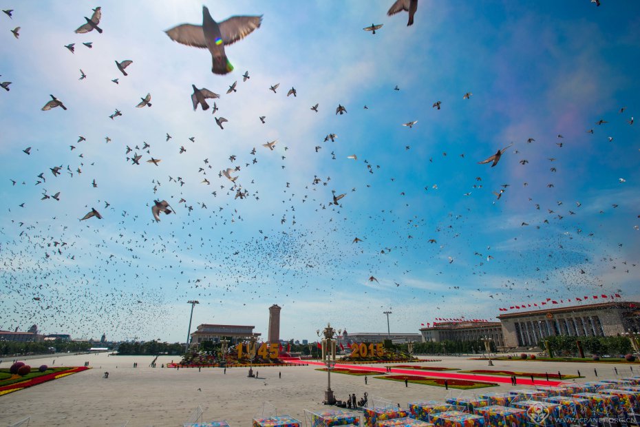 9月3日,中国人民抗日战争暨世界反法西斯战争胜利70周年纪念大会在北京隆重举行。这是白鸽放飞天空。 新华社记者李尕摄