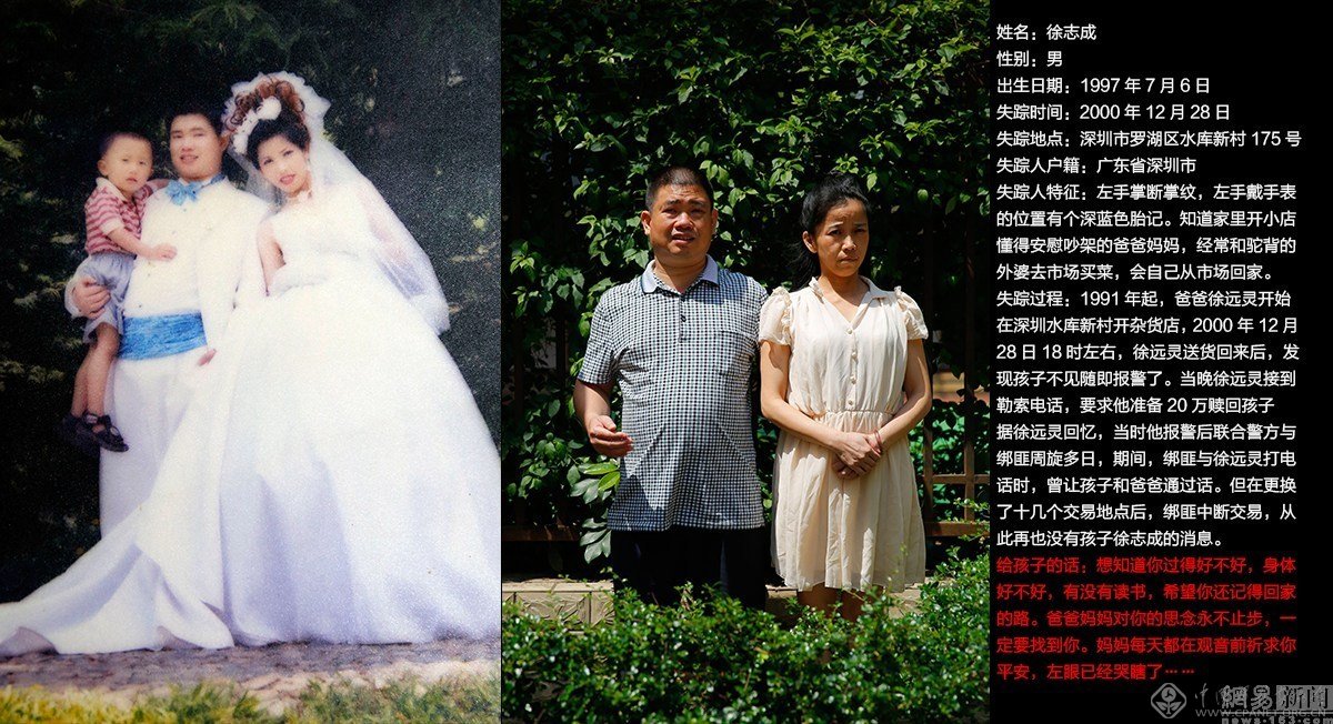 2000年12月28日18时左右,徐远灵送货回来后,发现孩子不见随即报警了。当晚徐远灵接到勒索电话,要求他准备20万赎回孩子。据徐远灵回忆,当时他报警后联合警方与绑匪周旋多日,期间,绑匪与徐远灵打电话时,曾让孩子和爸爸通过话。但在更换了十几个交易地点后,绑匪中断交易,从此再也没有孩子徐志成的消息。上图为失踪前,徐志成和补拍婚纱照的爸爸妈妈一起合影。下图为2016年5月,深圳罗湖,仍没有放弃寻找孩子的爸爸徐远灵和妈妈叶安妮。