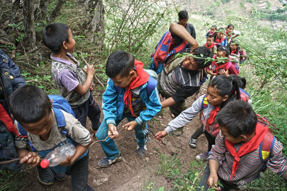 5月14日,在三名家长的保护下,15个孩子从勒尔小学出发,走崖壁,爬藤梯,踏上回家的路。