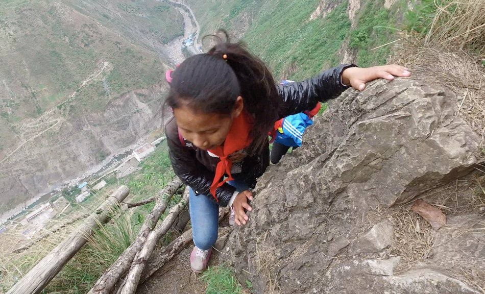 两个月前,外面的志愿者(女孩子)来到这里,爬到半山就哭得不行,不敢再下,村民就用背包带将其拴住,上面拽下面托,走到特别难走的那段路,是村民把她背过去的。四月份,有一个五十岁的当地村民从悬崖上掉下去摔死了。我之前也去过这种带有天梯的学校、村庄,但这个地方是我见过的最危险的。