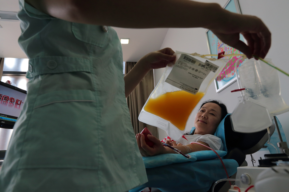 6月15日,即将退休的王佩红献了一个治疗量(250毫升)的血小板,这是她第13次义务献血。她想把身体锻炼好,义务献血直至国家规定的最高年龄界限。