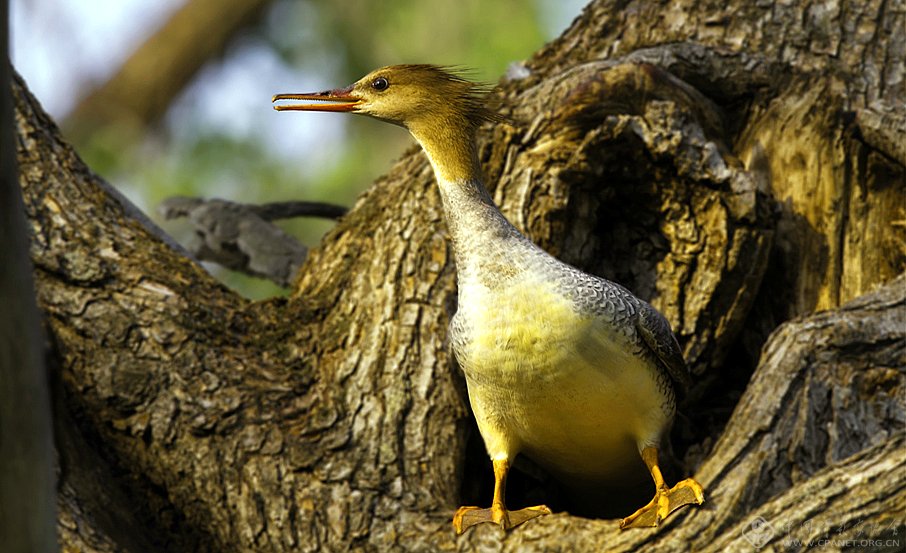 它生存距今已有一千多万年,是中国特产稀有鸟类,属国家一级重点保护动物。其分布区域十分狭窄,数量也是极其稀少,全球目前仅存不足一千只,属国家一级保护动物。因其在树洞中繁殖,小鸭出生后要从树洞中跳出,因此被称为中华第一跳。为拍下这一瞬间,摄影家不知要等待多少个春天。