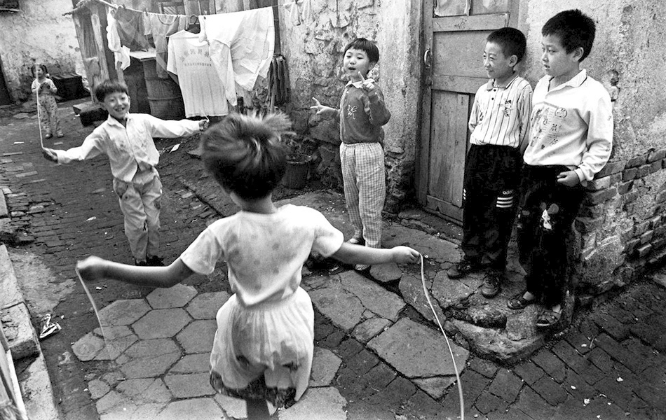1997年,山东青岛崂山大院里,跳绳玩耍的孩子。跳绳是许多中小学体育课的必选项目,简单易学,也是锻炼身体不错的选择。摄影:吴正中FOTOE