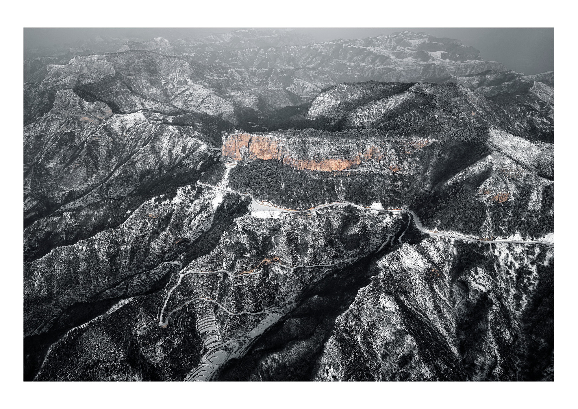 《太行》系列相对写实,作者朝太行痴痴地看过去,看定了这座山脉,就看到了山之峻、山之远、山之雄、山之阔、山之巍、山之褶皱和在褶皱中生存的人,以及人造的道路、村落和其他痕迹。苍茫大地在眼前幻化为黑白灰调的影像,偶尔夹杂着石壁的金黄,直接呈现出裸露着的地球的躯体。这是一个人与一座山脉构成的大地在对峙。在每幅作品里,作者站位都很高,接近鸟瞰,与一般生活里的平视相比,除观看的角度发生了变化,观看主体也突出出来。站在这样的高度,可以有更强的自我意识,一种难言的对峙感。所以,从观看方式上说,这个系列作品可以称之为“海拔1500米线(大约)上的观看”;从呈现方式上看,作者在色调上下了功夫,比较统一,这个系列的作品可以称之为“水墨太行”。